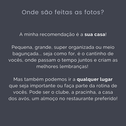 - As fotos serão disponibilizadas para download via galeria online, tratadas e em alta resolução. Prazo de até 30 dias.